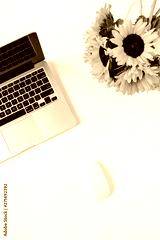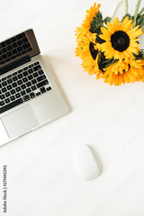 Home office desk workspace with laptop, yellow sunflowers bouquet on white background. Flat lay, top view freelancer / blogger work concept.