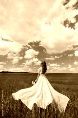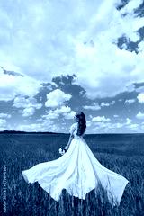 Beautiful young model woman with wedding hairstyle in white long dress posing in a green field in the summer sunny day