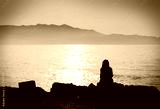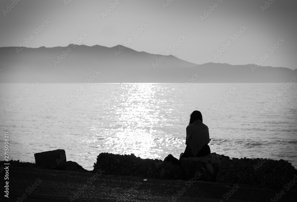 depression. black and white photo of melancholic alone girl sitting by the sea feeling sad and contemplating