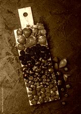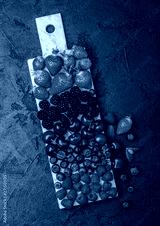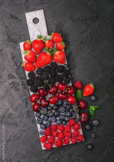 Fresh organic summer berries mix on white marble board on dark kitchen table background. Raspberries, strawberries, blueberries, blackberries and cherries.