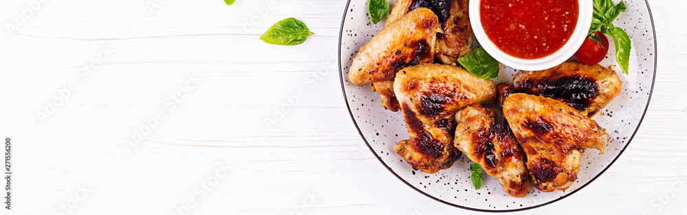 Baked chicken wings in the Asian style and tomatoes sauce on plate. Banner. Top view