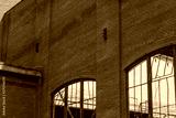 Abandoned warehouse brick wall with rusting metal window frames, no glass, horizontal aspect