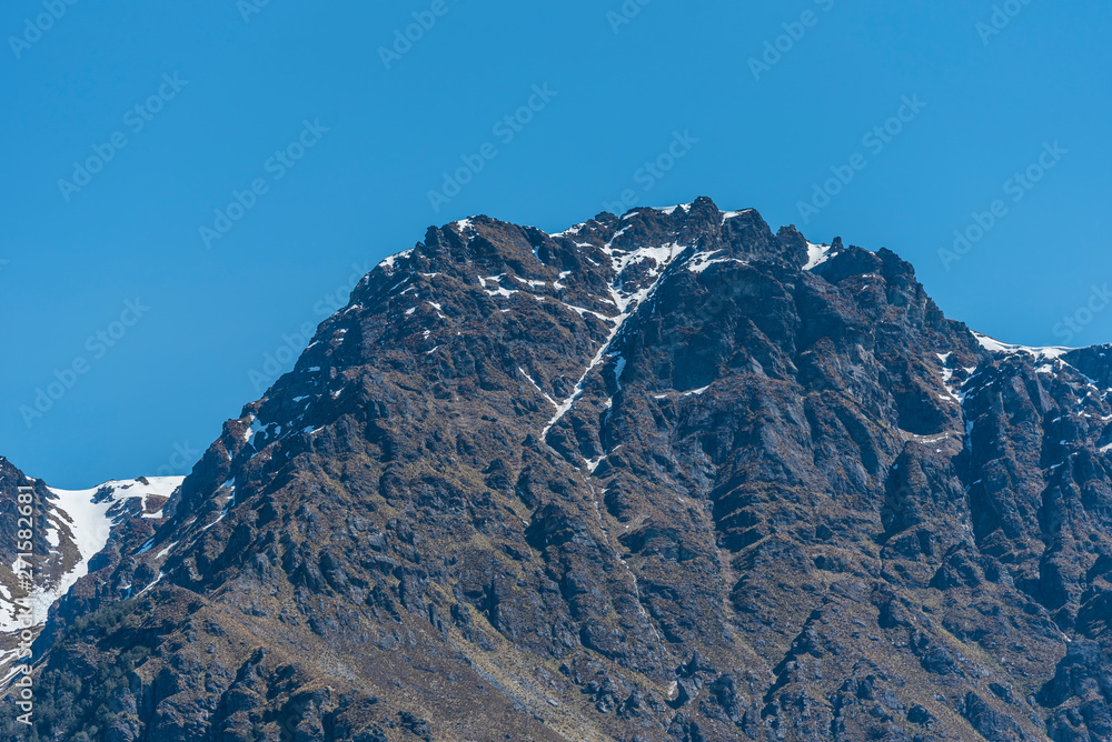 View of the snowy mountain peak against the blue sky, Queenstown, New Zealand. Copy space for text.