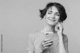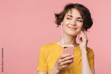 Happy young beautiful woman posing isolated over pink wall background listening music with earphones using mobile phone.