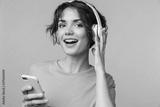 Happy young beautiful woman posing isolated over pink wall background listening music with earphones using mobile phone.