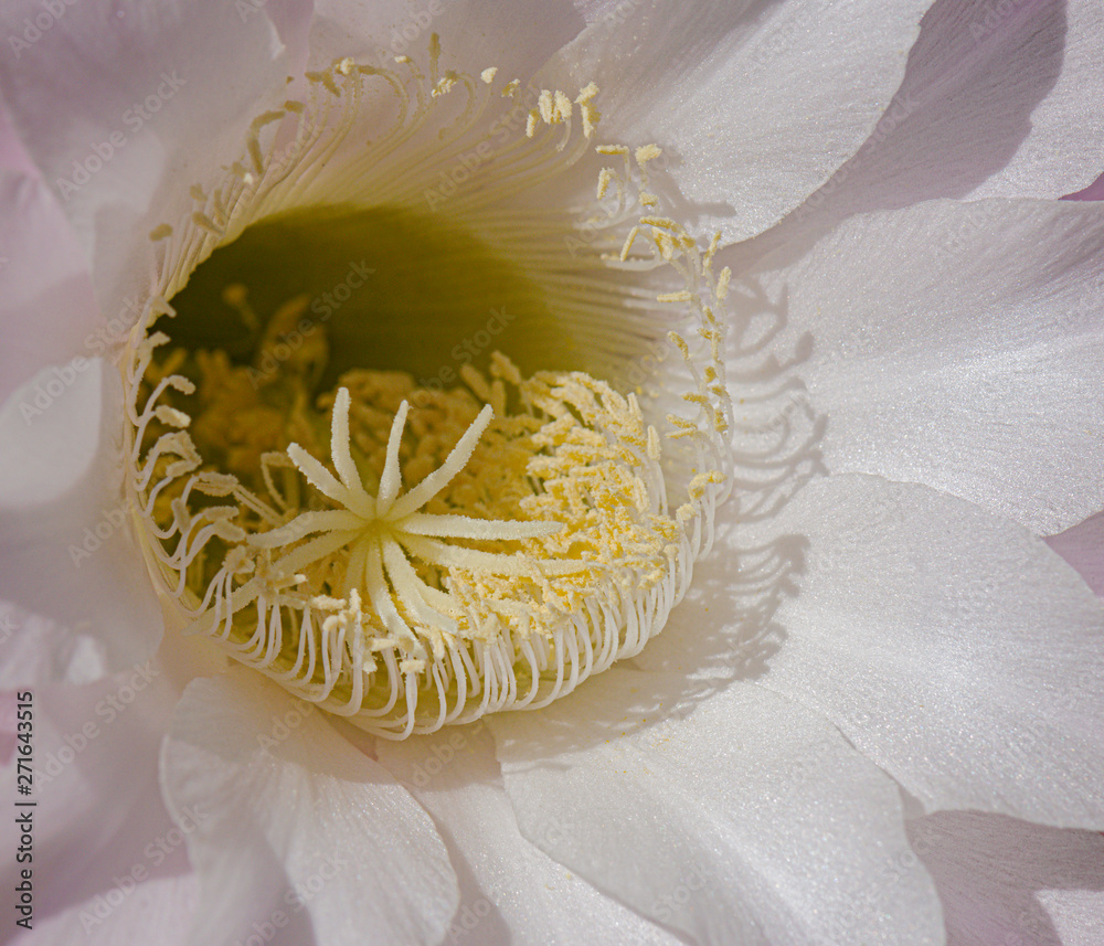 closeup of the center of a white night blooming echinopsis cactus flower showing the star shaped stigma