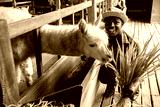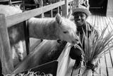 Smile African farmer man holding and feeding grass for a sheep in the farm