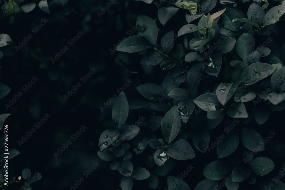 Small sharp leaves with raindrops covering them in low light – Dark nature background of lush rainforest vegetation with wet plants in detail