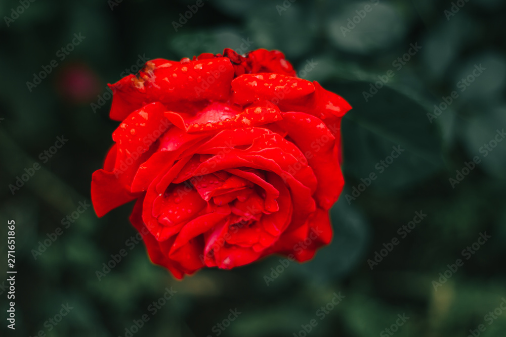 Single red rose with big and fleshy petals sitting on a dark green background – Vibrant and beautiful flower associated with love and passion – Decorative and ornamental blossom in the garden