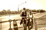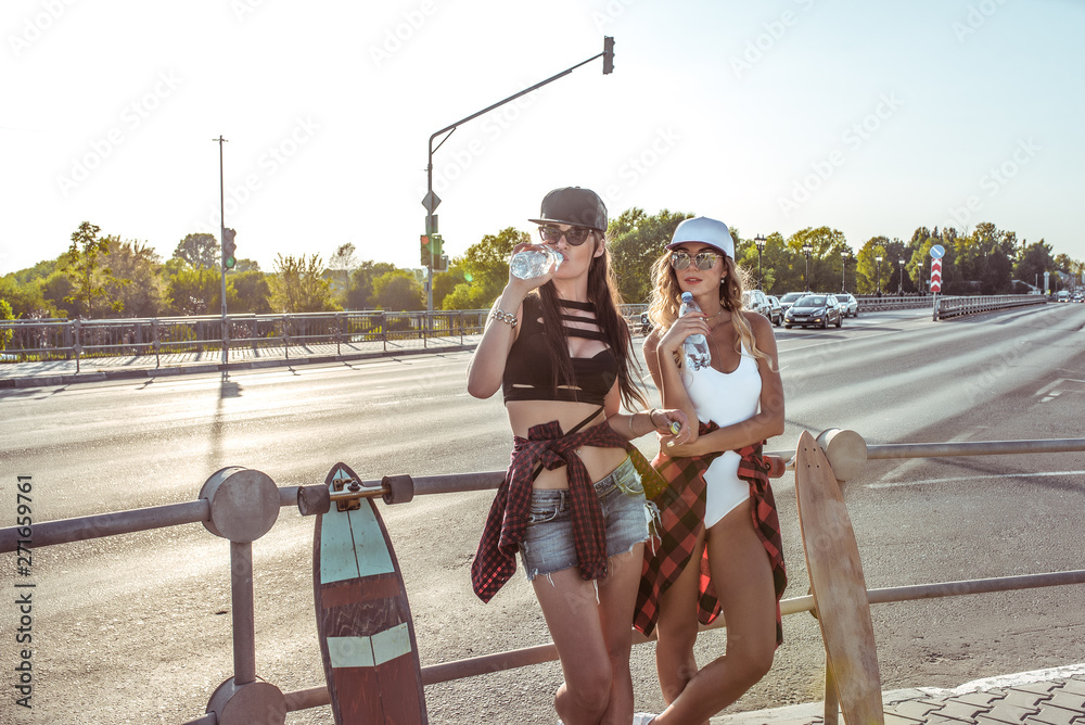 Two girls girlfriends students drink water in summer city, skate boards, swimsuit shorts. Resting long hair tanned figure. Background road cars. Fashion style, modern lifestyle. Free space for text.