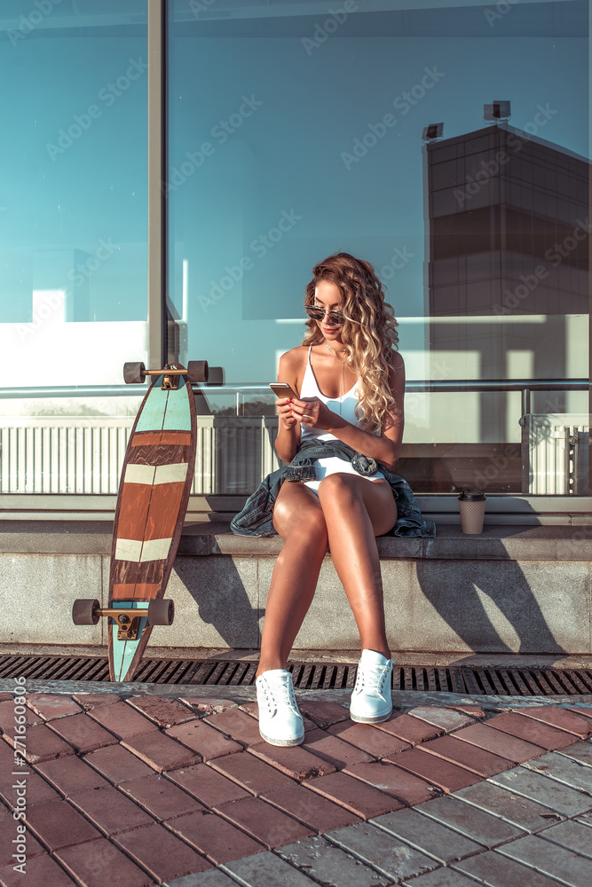Summer city, woman writes message phone, online internet application, correspondence social networks. Reading news tapes smartphone. Skate longboard, long hair cup coffee tea. Free space for text.