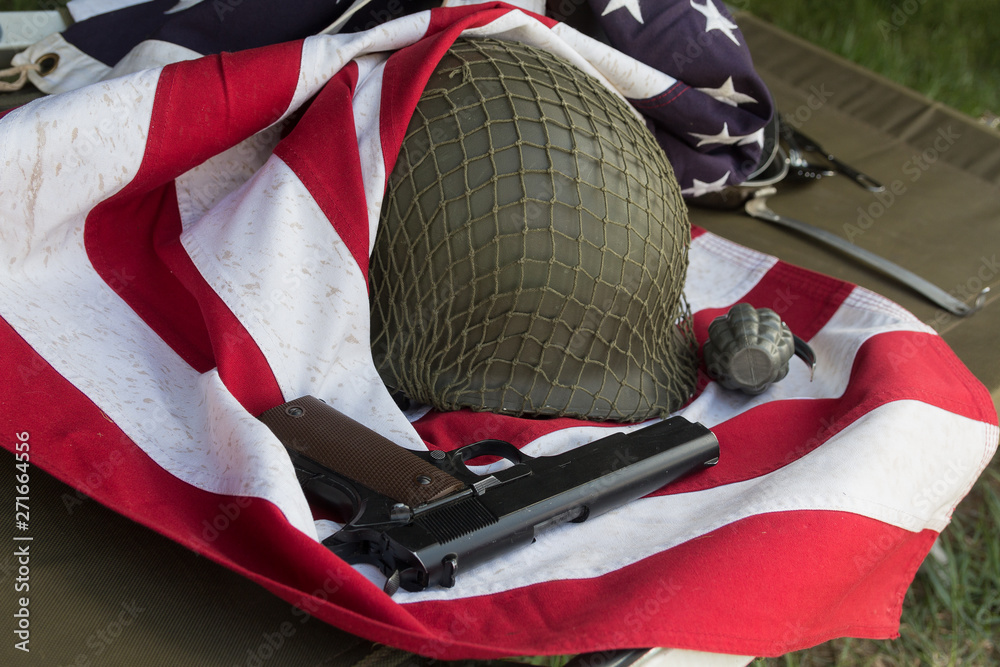 Soldier helmet, pistolt and grenade from the Second World War and the flag of the USA. Patriotism