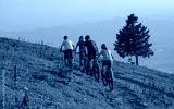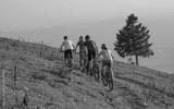 Group of mountain bikers pedalling their electric bikes up a narrow dirt road.