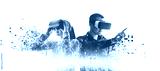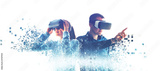 A man and a woman in glasses of virtual reality. The concept of modern technologies and technologies of the future. Fragmented by pixels. VR glasses.