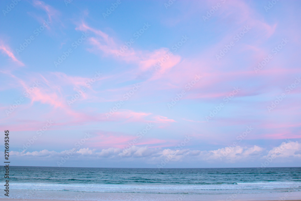 pretty pastel colour sky pink purple blue with fluffy cloud on beach with white sand Australia Gold Coast