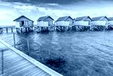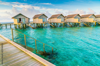 Beautiful water villas in tropical Maldives island at the sunrise time .