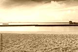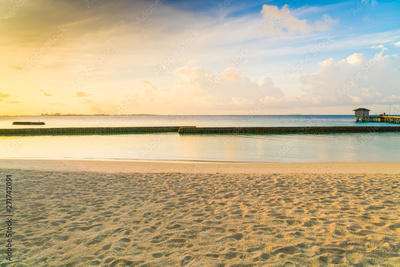 Beautiful sunrise over beach with the water villas in tropical Maldives island .