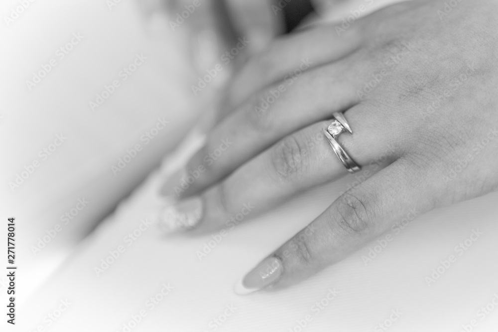 engagement ring of the girl's hand in black and white. wedding ring of a woman's hand. ring and beautiful manicure.