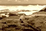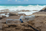Plastic water bottles on the sea shore left by tourists. Pollution in ocean. Environment concept