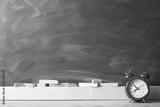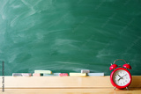 Back to school. Red alarm clock and chalk on a wooden surface against a green blackboard. School background with space for your text