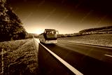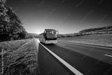White bus traveling on the asphalt road around line of trees in rural landscape at sunset
