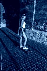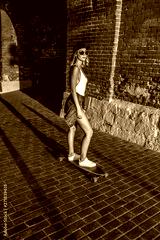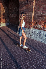 The girl in the summer rides a skateboard, rest in city at the weekend. Fashion youth style, modern bold, daring lifestyle. Concept walk rest emotions smile and lay woman in white bodysuit.