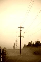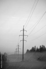 Power transmission line supporting structure at sunrise in the fog
