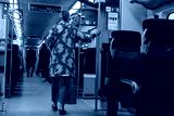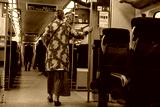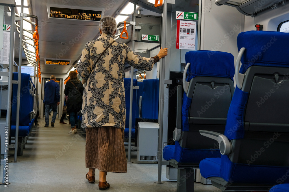 Moscow, Russia - May, 9, 2019: image of an old woman holding a handrail in a subway car