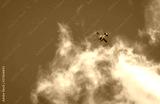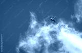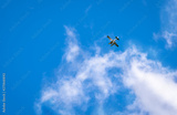 Float plane overhead, flying towards sunny blue sky from partial clouds. Copy space, background