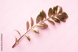 Floral minimal style concept. Exotic summer trend. Golden tropical leaves and branch on pastel pink color background. Shiny and sparkle design, fashion concept.