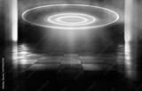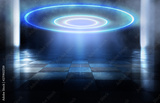 Dark empty scene, blue neon searchlight light, wet asphalt, smoke, night view, rays. Empty black studio room. Dark background. Abstract dark empty studio room texture. Product showcase spotlight back