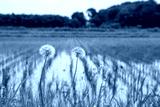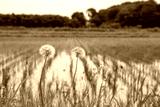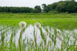 田植えが終わったばかりの田んぼとタンポポの綿毛