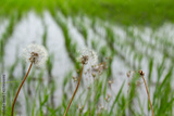 田植えが終わったばかりの田んぼとタンポポの綿毛