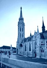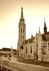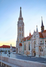 Saint Matthias church and tower in Budapest, Hungary. Morning sunrise sky and deserted area.