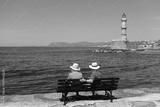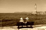 Photo of unidentified elder couple enjoying the view to old Venetian lighthouse in old harbour of Chania, Crete island, Greece