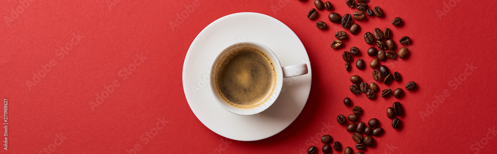 top view of delicious coffee in cup near roasted beans on red background, panoramic shot