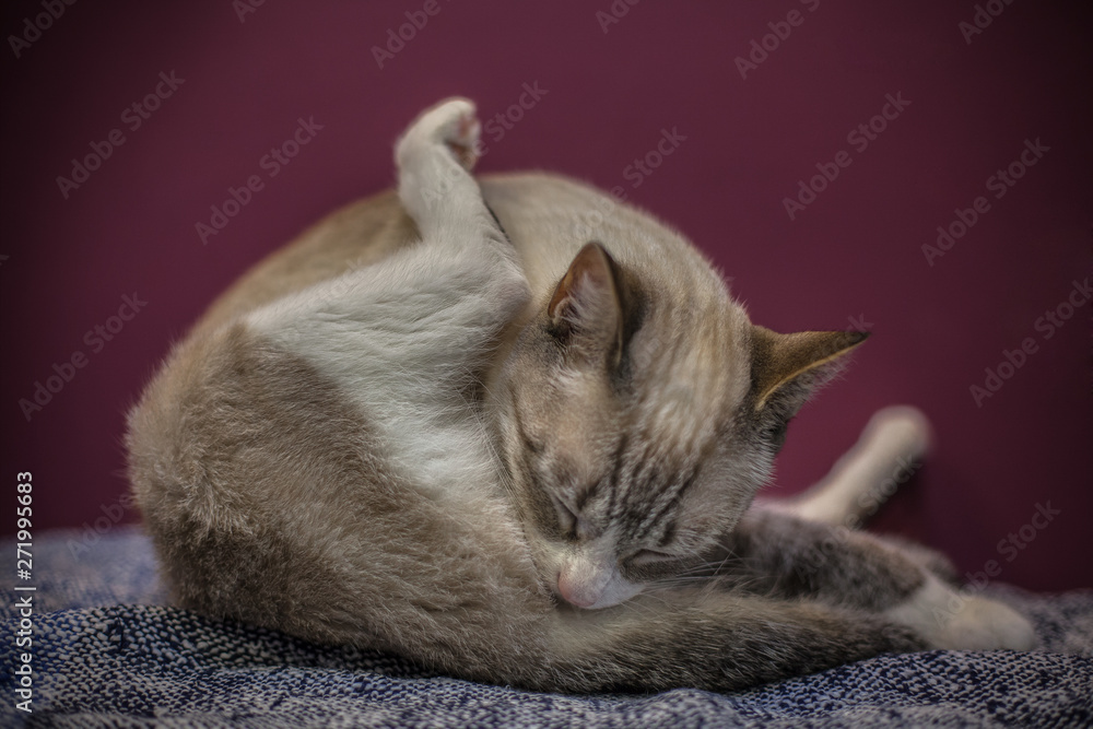 The gray cat sits on a bottom on blue rug and is licked, close up