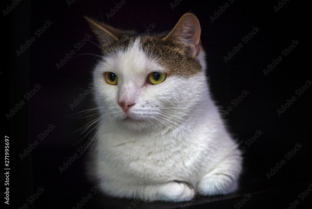 Munchkin cat, portrait of a manchkin on a black background, short paws, a large muzzle with yellow eyes, a white cat