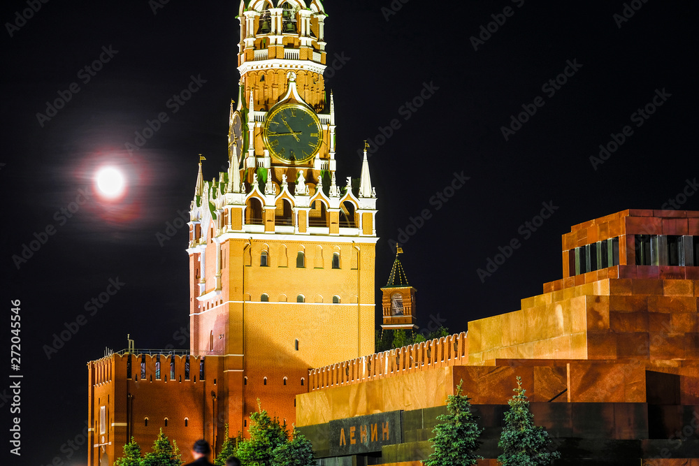 Mosocw, Russia - May, 20, 2019: Red Square and Moscow Kremlin at moon night