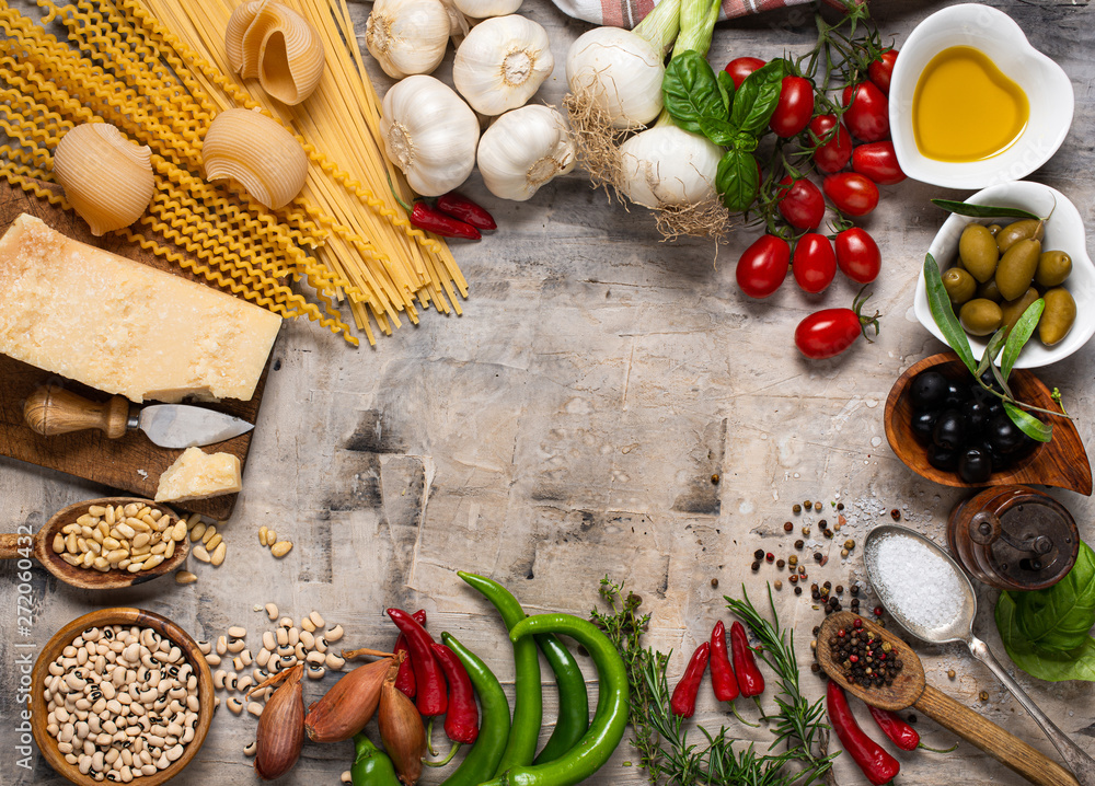 top view, on a dark rustic background, raw pasta and traditional Italian ingredients with olive oil, parmesan, vegetables, legumes and various types of spices