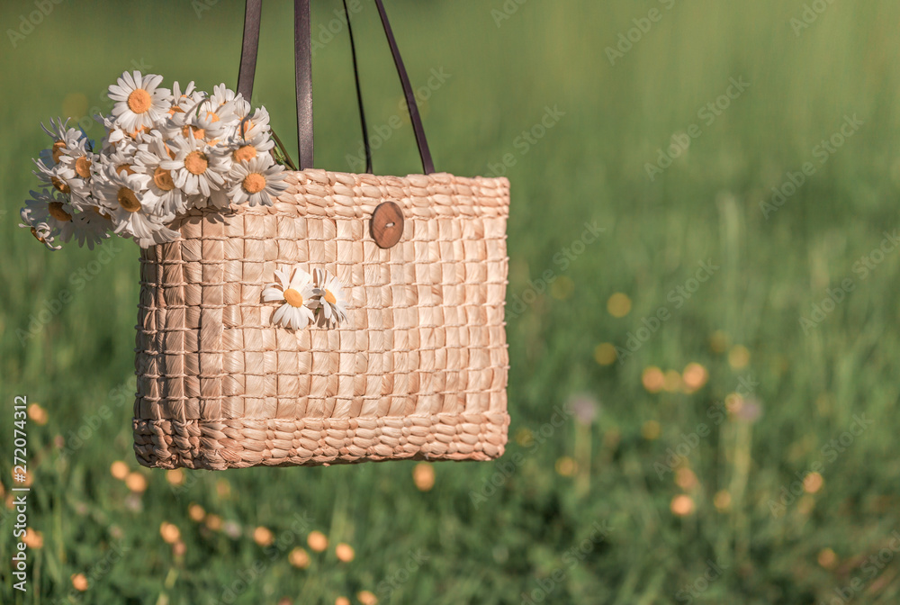 Floral scene with bouquet of white flowers, daisies in old wicker bag, basket, green grass blurred background, daylight, farmhouse composition, rural style