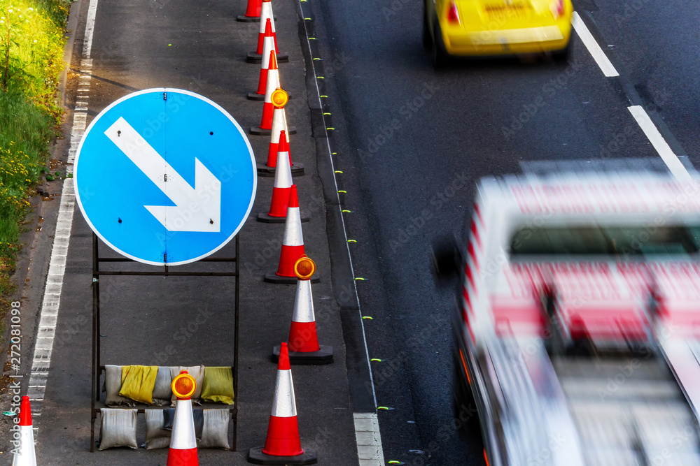 UK Road Services Roadworks Cones and directional Signs on motorway