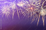 bright, colorful New Year's fireworks on an interesting abstract background with stars and beautiful bokeh