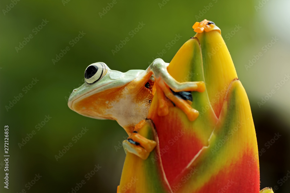 Beautiful tree frogs with colorful flower buds, Flying javanese frog, rhacophorus reinwardtii