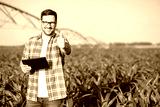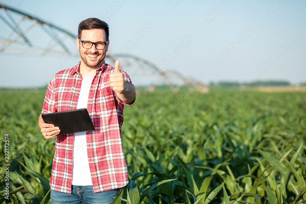 Happy young farmer or agronomist in red checkered shirt showing thumbs up and smiling directly at camera. Standing in corn field, holding a tablet. Organic farming and healthy food production