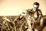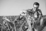 Smiling happy young agronomist or farmer wearing red checkered shirt taking and analyzing soil samples on a corn farm. Organic farming and healthy food production