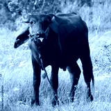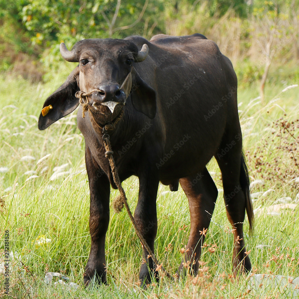 indian black beef with ear stud on grass field