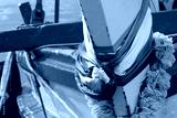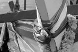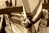 Close up details of the decorative ribbons in the colors of Thailand’s national flag attached to the pole on the front of a traditional wooden Thai fishing boat.