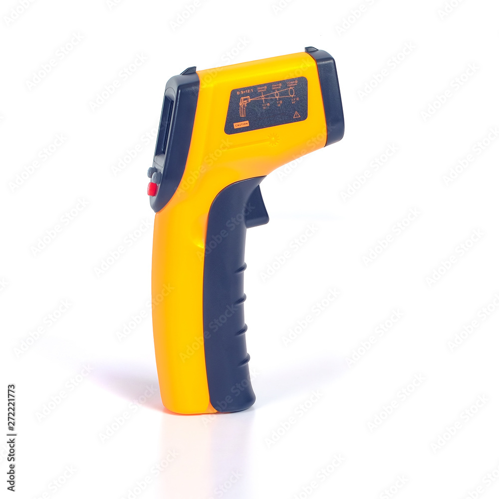 Yellow Infrared thermometer gun used to measure temperature on white background.