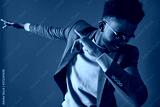 Cheerful Afro American man in glasses dancing on red background
